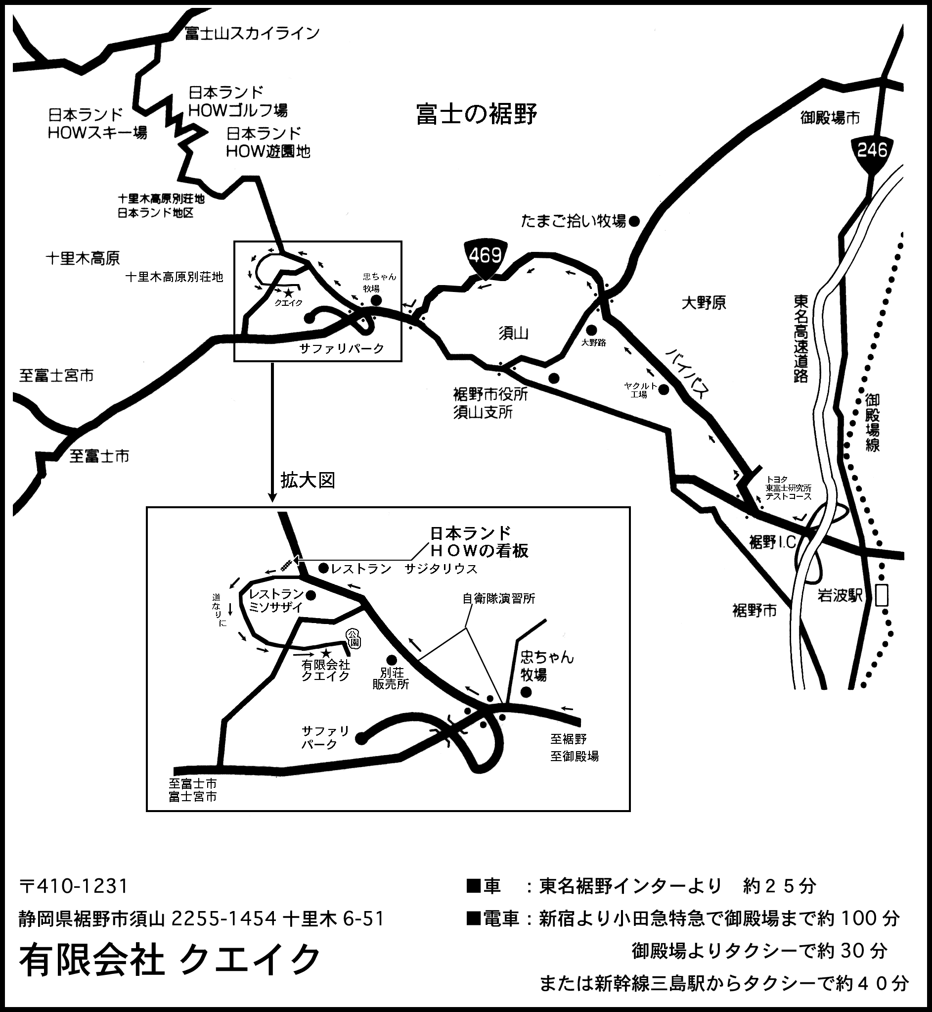 有限会社 クエイクは、富士山の裾野、十里木高原別荘地の中にあります。すぐ近くには